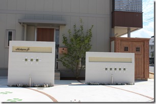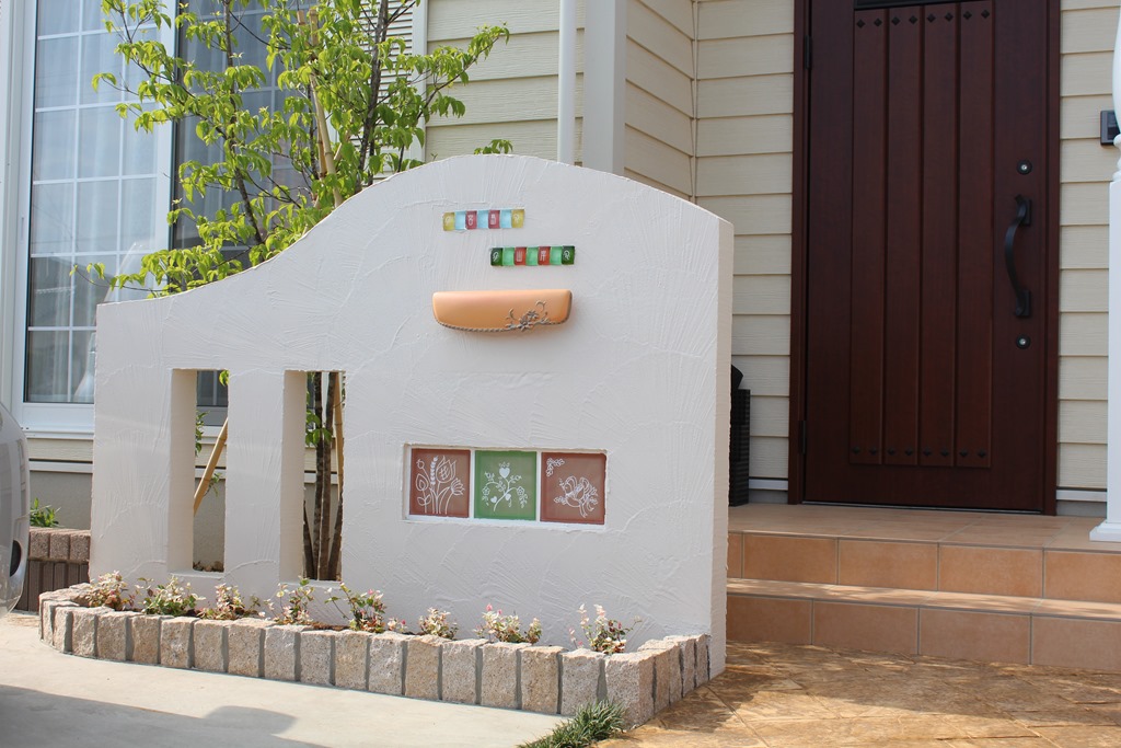 玄関前にRの曲線の塗塀の門柱を作れました。ホワイト系の塗壁にニューカットダルサインを二世帯分取り付けています、ディーズガーデンの可愛らしい埋め込みポストの下にガラスブロックにデザインを彫りこんで取り付けました、変化を持たせる為にスリットをふたつ長野市内の外構施工現場です。 塗材はジョリパット仕上げです。