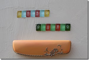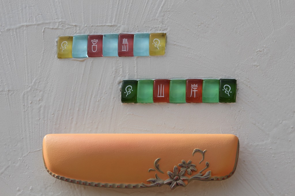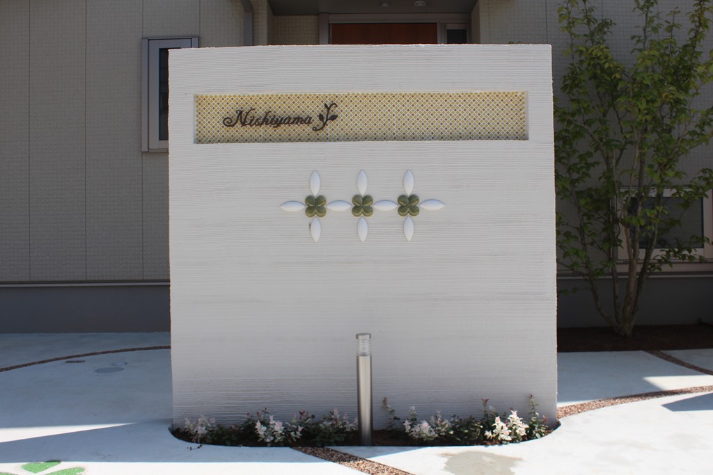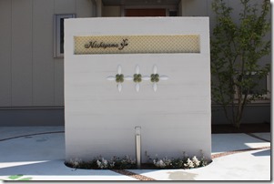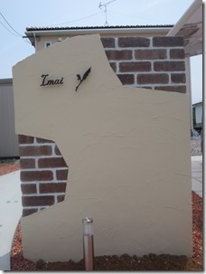 塗り壁の門柱のヒュウサツヲ取り付ける部分を凹ませてタイルを貼りこみディーズガーデンのアルミ鋳物サインとミニオーナメントを取り付けています。 夜になると凹みの天端に組み込まれたLED照明が点灯してとてもきれいに見えてきます。 長野市内の外構施工現場です。 塗材はジョリパット仕上げです。