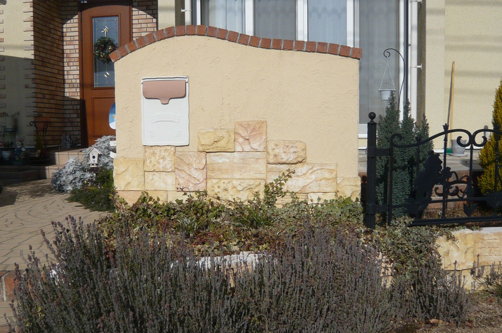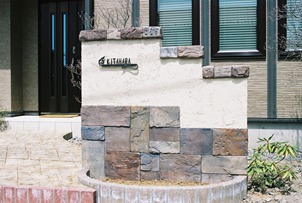 門柱の笠木と門柱の下の部分をスコレツト工法で仕上げました、スコレットは形押しでは無く手切りで形を作ります表面の厚みも変えよりリアルに仕上げます、色も何色もある色の調合を変えながら色付けしていきます。