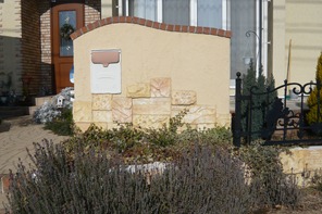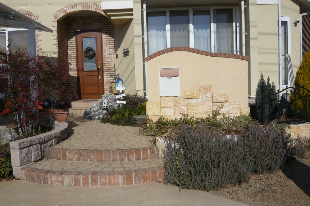 門柱の腰から下の部分と、駐車場の土止めの壁面をスコレット工法で仕上げました、手間と時間の掛かる工法ですが、それだけの魅力のある工法です、写真には写っていませんが駐車場の隅の壁面はお客様と一緒に作っていました。