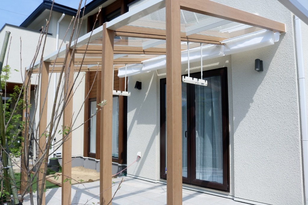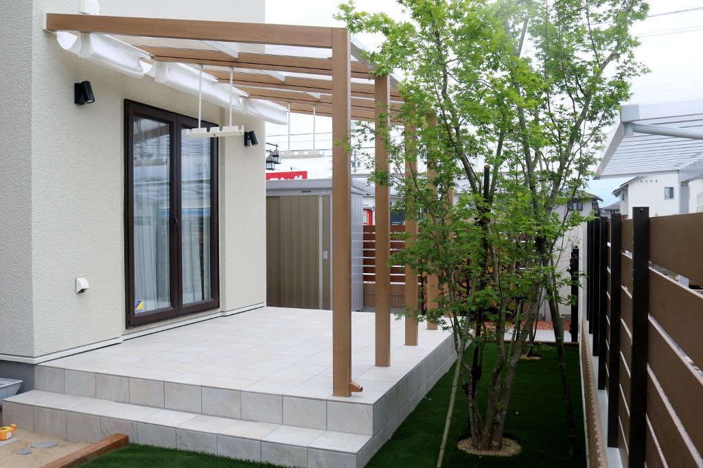 エクステリアデザインを考える時に、その家で暮らす人たちが楽しく暮らせるように提案しています。リビングの前にタイルを貼った床を作りそこにココマテラス間口2間×出巾8尺の日除け付きテラスを取り付ける事で庭に出て過ごす時間が増えるようになります。