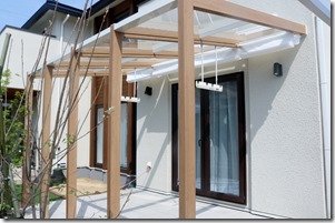 ココマテラスの特徴は、柱がメートルピッチで立木目のラッピングカラーの施工ができる事、雨どいが両側の柱の中にある事、いちばんは内部日除けの取り付けが出来る事です。