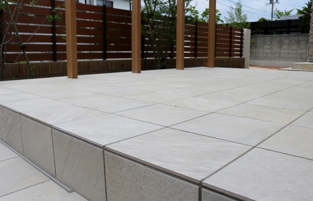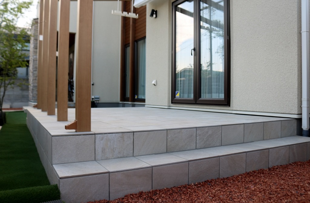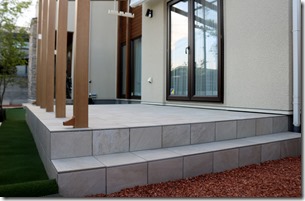 テラスの床は300角イタリア製テラスで両側に階段を設けエクステリ照明を設置したので夜になっても利用し易くなっています。 クリエラスク+アイボリーホワイト内部日除けホワイトの現場は長野市内外構。