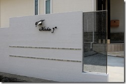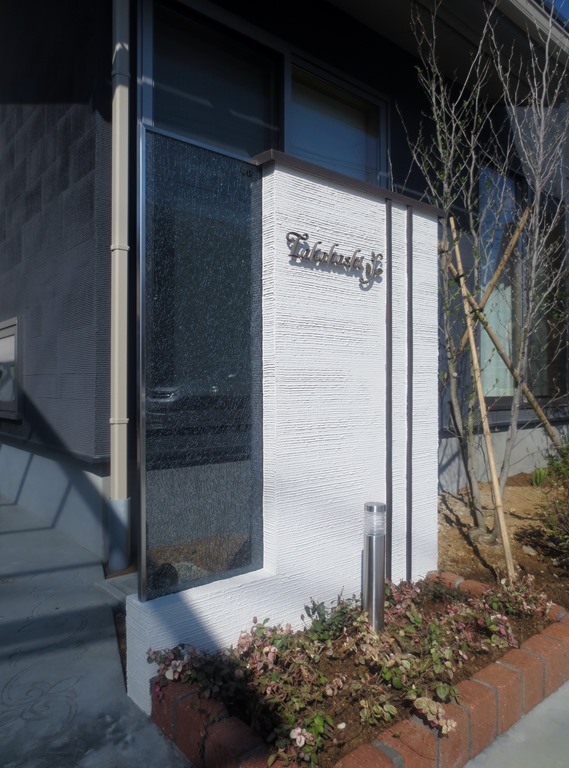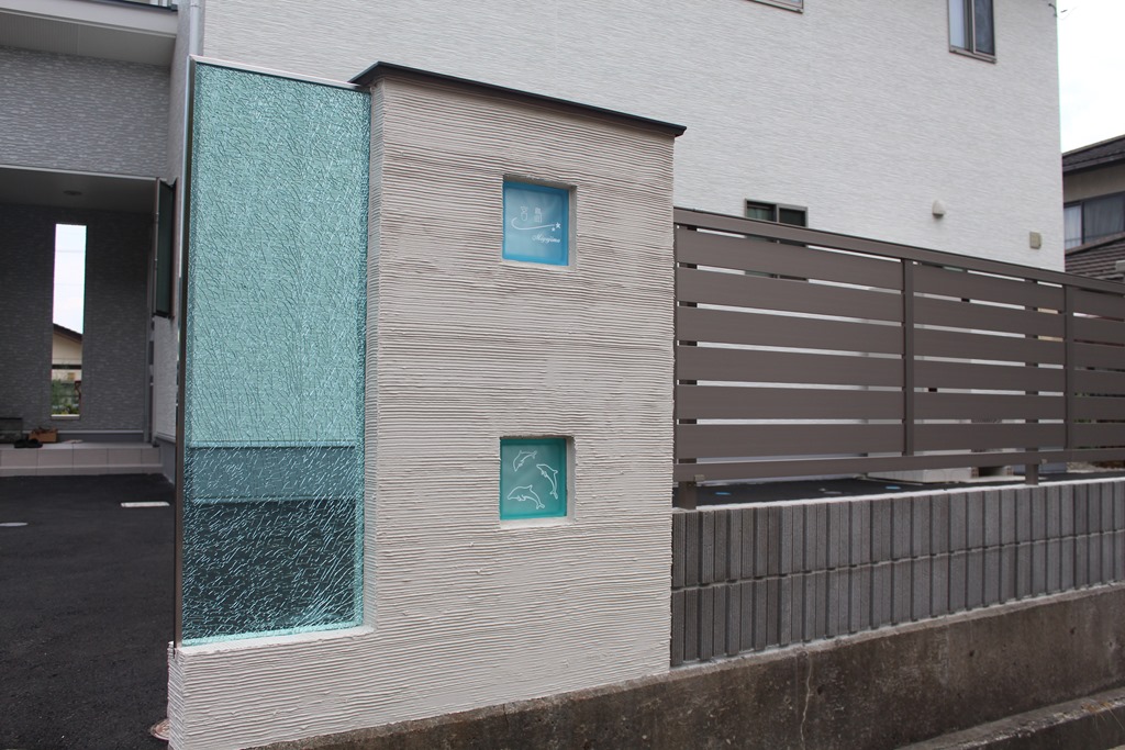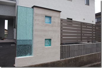 クラック模様が魅力的なジュエルグラスのカラーLタイプです。Lタイプは上部と片側面が壁と離れている商品になります。ブルー・ブラウン・グレーのカラーがあり、クリアタイプとは異なる魅力がありますが、夜になりエクステリア照明を当てると、クリアタイプと全く同じように見えてきます。