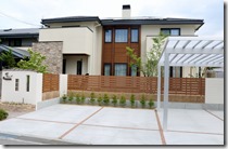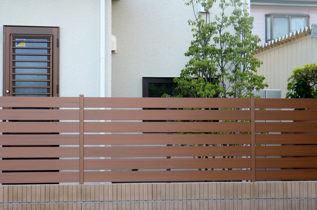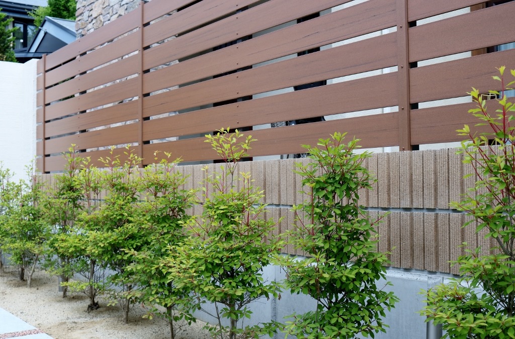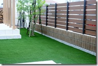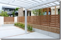 駐車場の後ろと東側の境界を、基礎上に化粧ブロツクを2段積み、樹脂板フェンス、マイティウッドを7段張りで目隠しを兼ねた塀にしました。