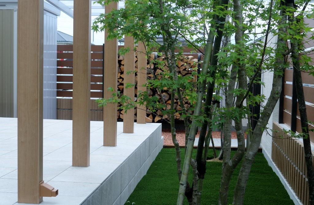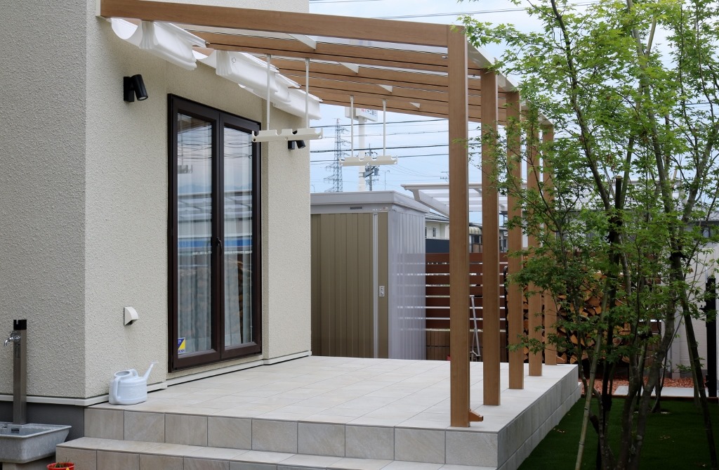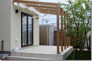 リビングの前にココマオープンタイプテラス日除け付きを取付床は300角タイルを貼って仕上げました。 テラスと樹脂フェンスの間に植木を植えました。