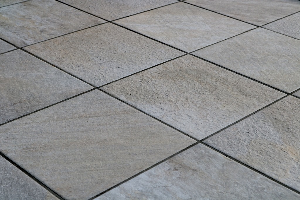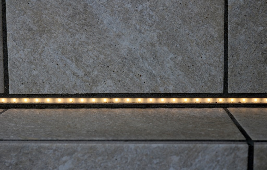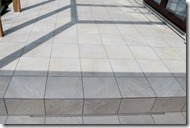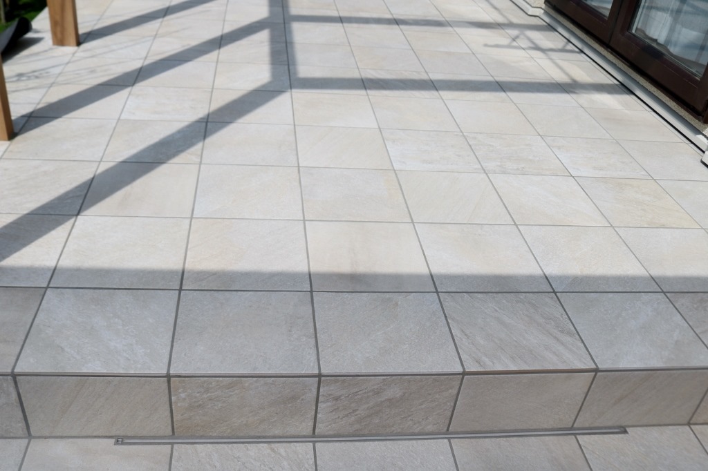 床のタイルはイタリア製タイルを貼り、両サイドに階段を作り、LEDエクステリア照明を取付て夜間もテラスが利用しやすくしました。