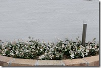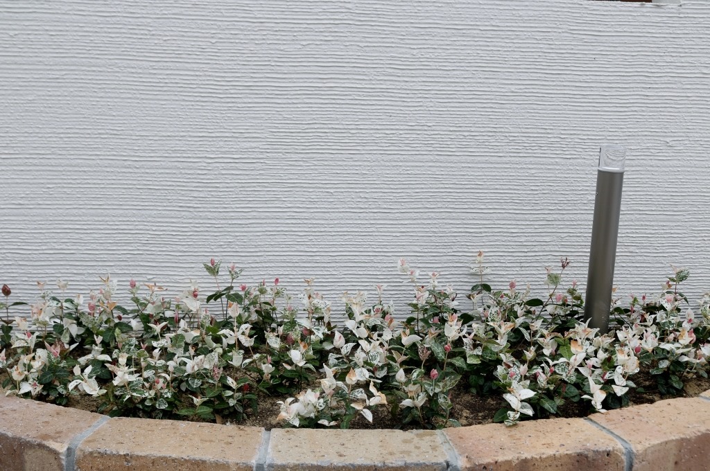 門柱前の花壇は、常緑のハツユキカヅラ・通路と駐車場の堺は常緑のサツキ植えこみ、西側の境界と駐車場後ろの土留め前にドウダンツツジを植えています。