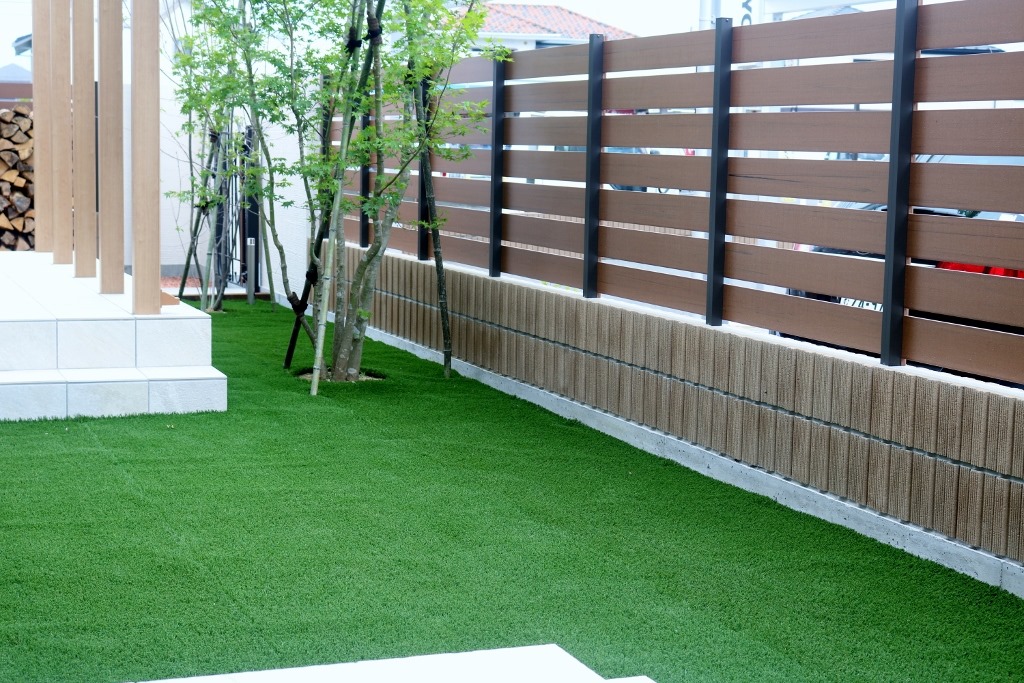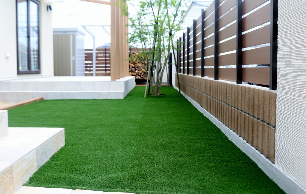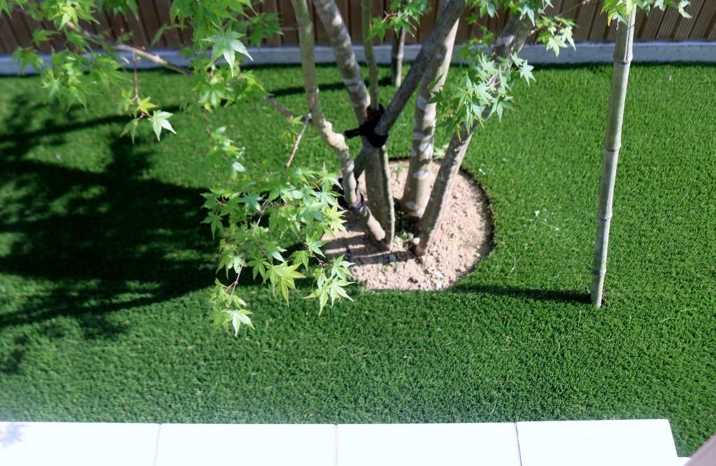 建物の南側で土の見える場所は、殆どありません。 人工芝敷きこみ庭の管理が楽にしました。