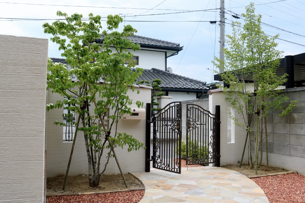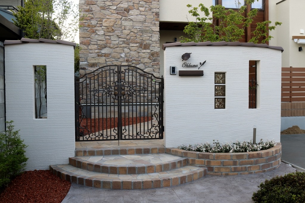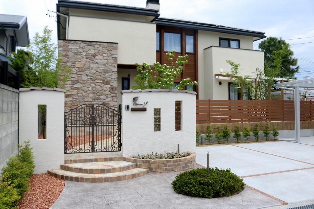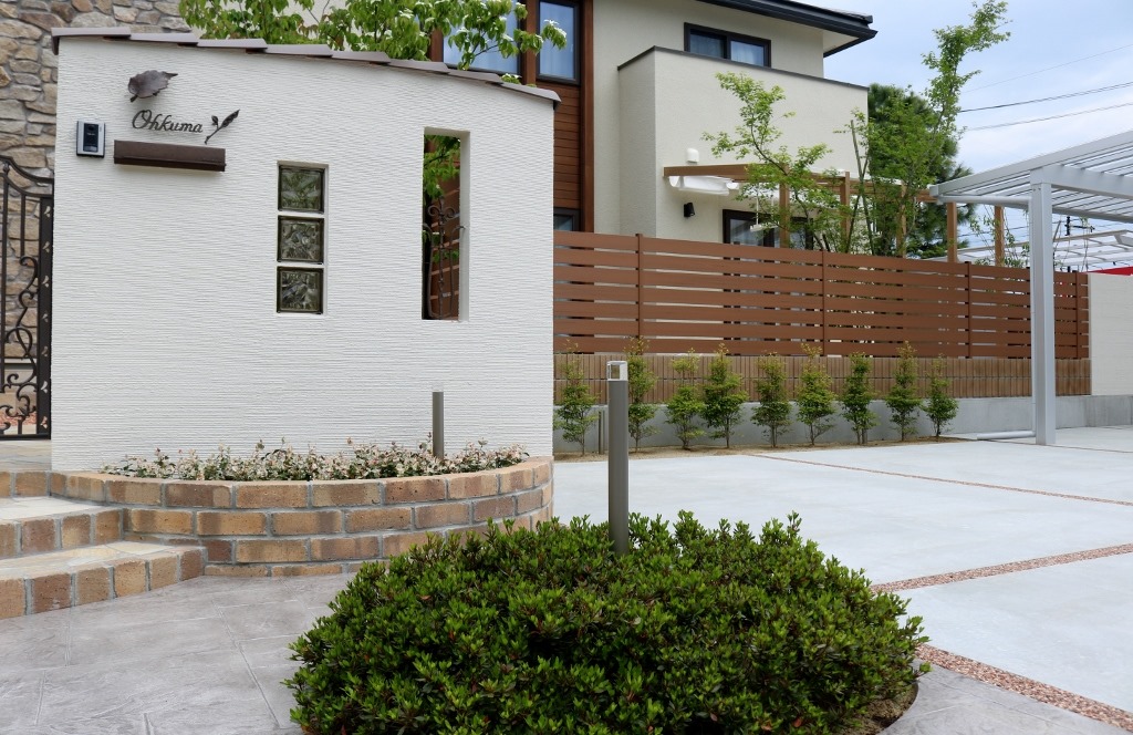 お客様と打ち合わせをして、希望を取り入れたうえで、おまかせで外構デザインをしました。 駐車場と建物の建つ敷地との高低差があるのでジョリパット塗仕上げの門柱前に天然石貼りの階段を扇状に作り、駐車場の後ろは基礎で留めをして化粧ブロックを積み樹脂板フェンスを施工して、できるだけ植栽を多く植え込みまとた。