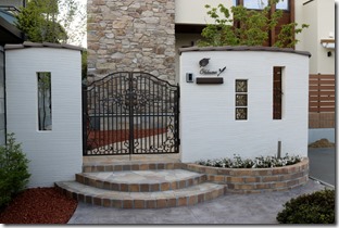 クローズ外構で門扉は、デイーズガーデンのアルミ鋳物レンヌの両開き、塗壁の天端に洋風瓦風を乗せデイーズサイン・ミニオーナメントの上に表札灯リーフ、ガラスブロックを組み込み、スリットにはRフィックスフェンス。