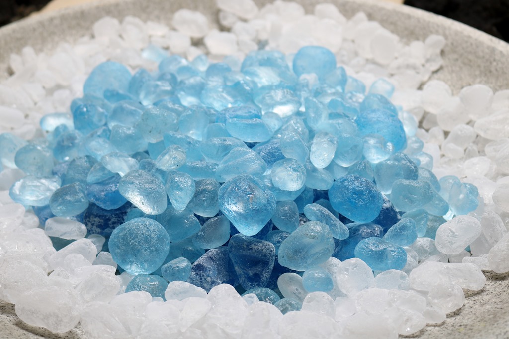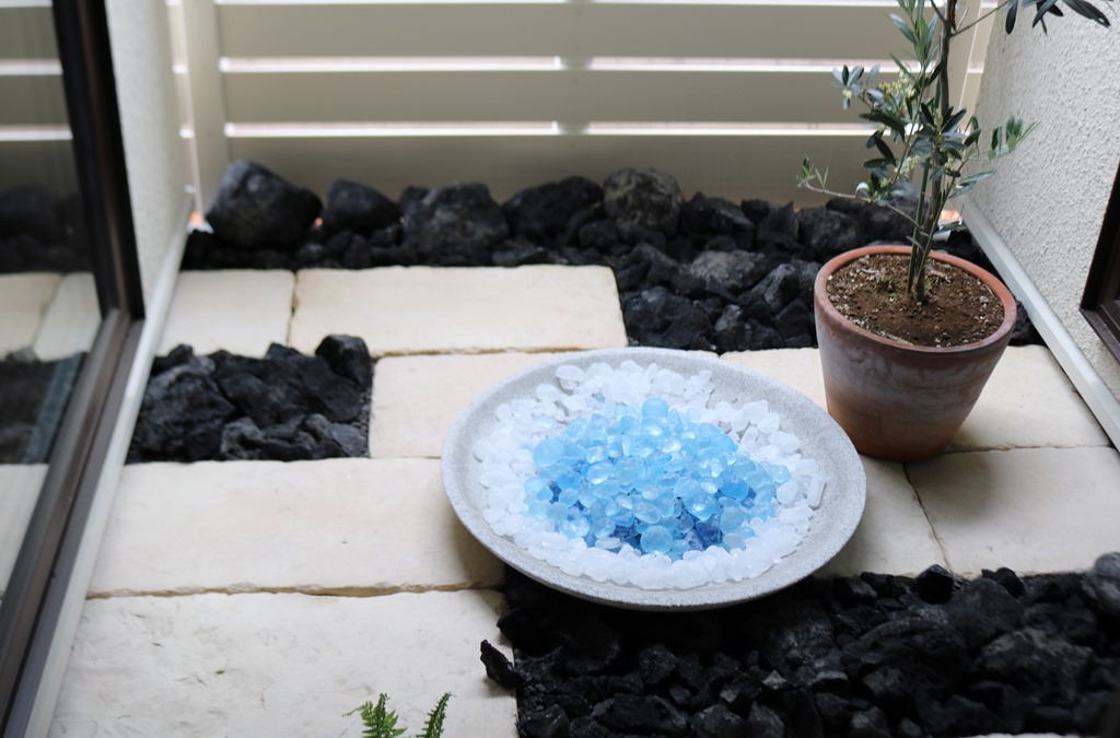 屋根があり、雨の当たらない場所の坪庭はブラッドストーンの平板と浅間の軽石で作り外側には樹脂板アルファウッドのアイボリーで目隠しを兼ねてハンキングで出来る状態を作り、御影石の水鉢の中に水の代わりにリコストーンのクリア・ブルーを盛るようにして入れました。