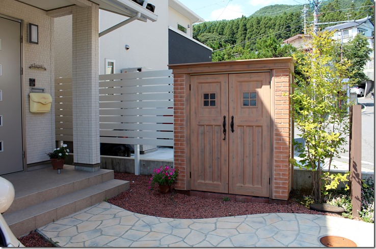 玄関前のおしゃれ物置が際立ちます。