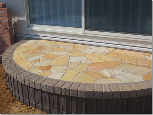 リビングの前には縁を化粧ブロックで積、床部分を天然石貼りで仕上げました。