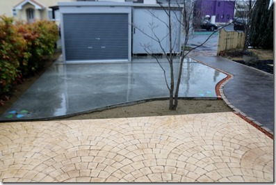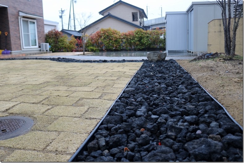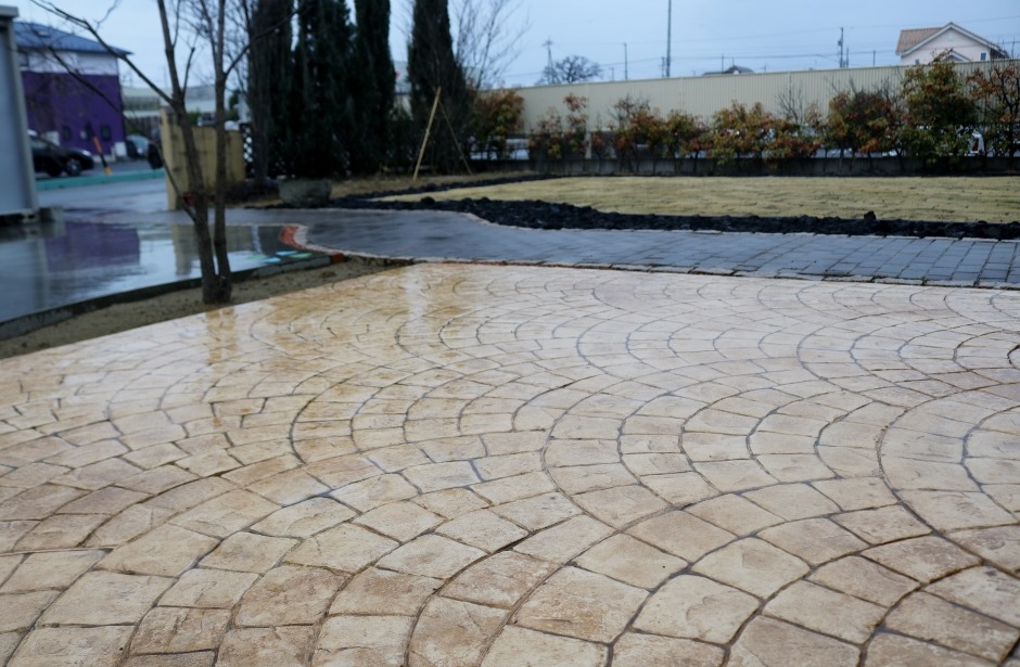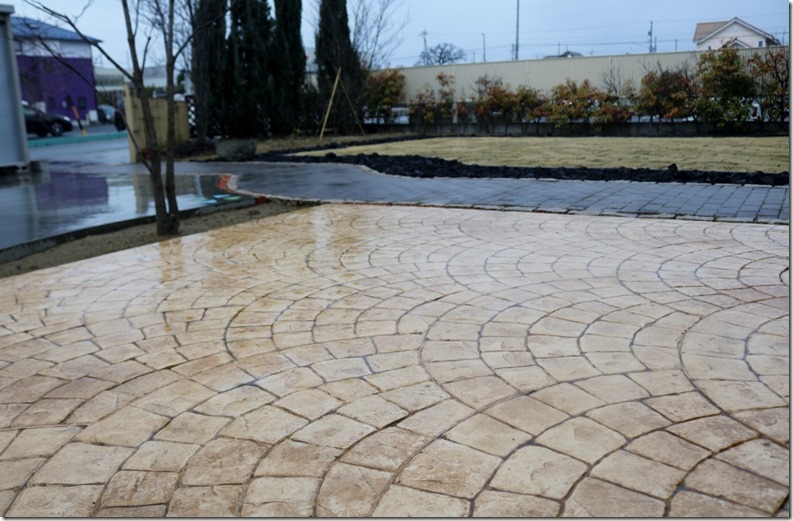 イナバのバイク庫と物置を新設して、そちら側がコンクリート仕上げ。建物よりは、ただのコンクリート仕上げでは寂しいので、当社が特委としているスタンプコンクリートのヨーロピンでヨーロッパの石畳風に仕上げました。スタンプコンクリートはコンクリート打設時に同時に色粉を撒きゴムマットで形押しして仕上げたものです。