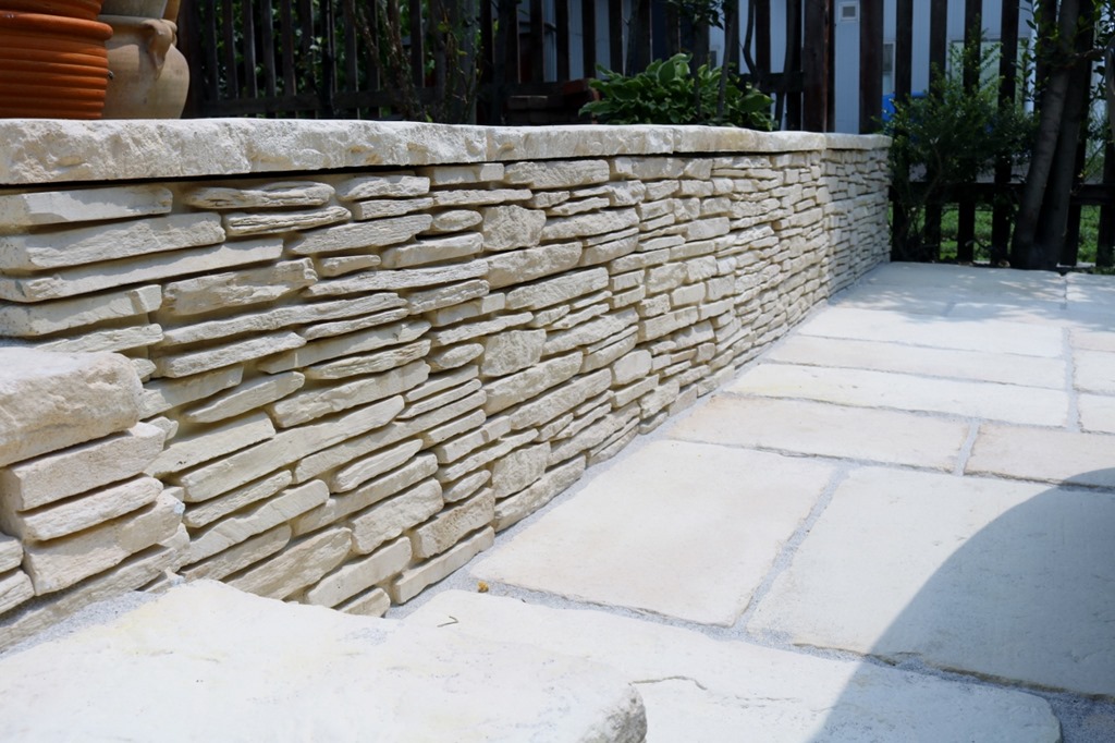 ブラッドストーンのジロンデカラーでサークル・マドックZで花壇・土留めなど・平板は石畳など洋風の庭に、相性のよい擬石です。