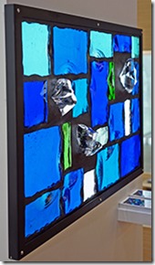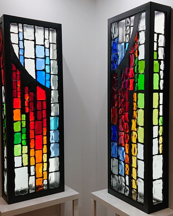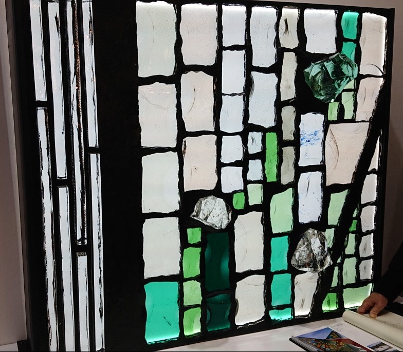 厚さのあるダルガラスをシェル加工してブラックの特殊配合してエポキシ樹脂で仕上げた作品です。 長野運動公園総合葉民プール・アクアウイング建物の外壁に取付けられている、ガラスと光の融合が素敵でエクステリアの壁に取付ける事を考えているトレドの新アイテムです。