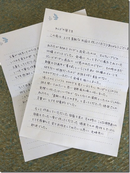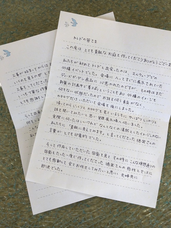 この度はとても素敵なお庭を作ってくださりありがとうございます。