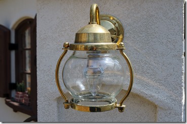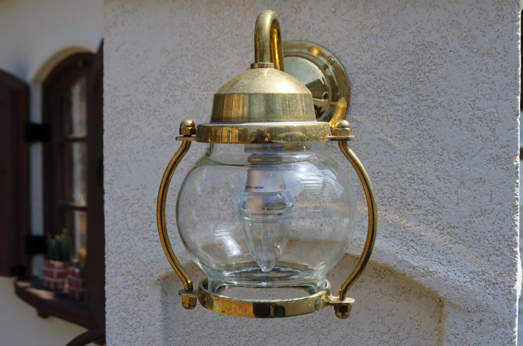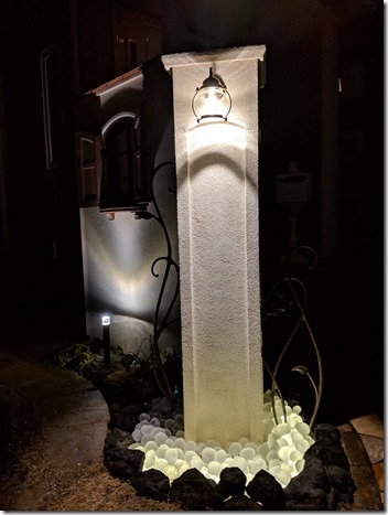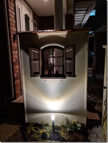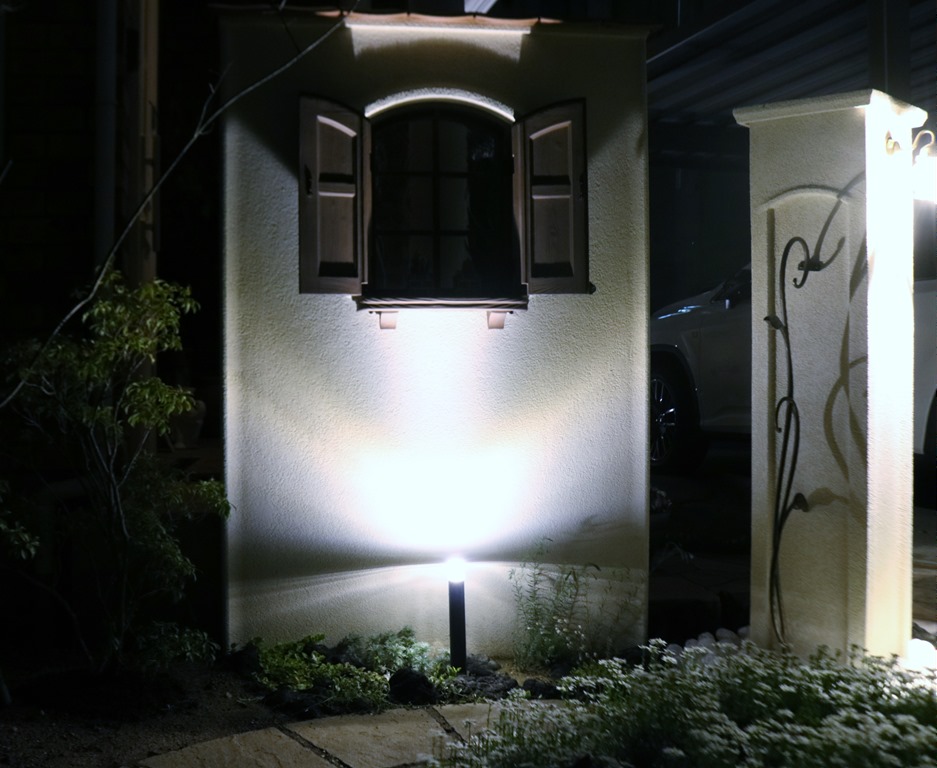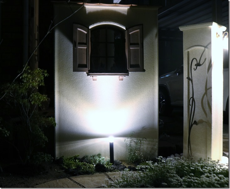角柱に取付けた真鍮製ポーチライトは100Vで、出来れば12V用があって欲しい商品です。 角柱の足元にtoledoオリジナルのリコストーン(ガラス玉)を敷き込み、その下にLEDテープを設置しているので、点灯するとリコストーンを透過して素敵なエクステリア照明になります。