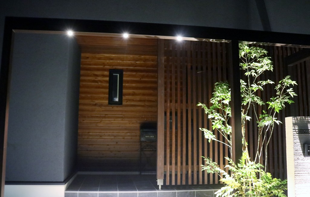 玄関前のエクステリア照明に、toledoオリジナルを照らし、プラスGで通路を照らす。 エクステリア照明を取り入れたデザインは、エクステリアの魅力を一段と引き立ててくれます。