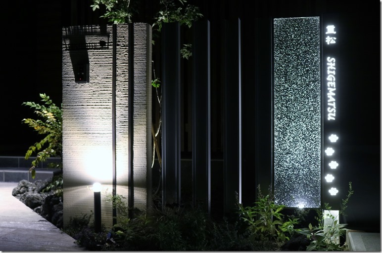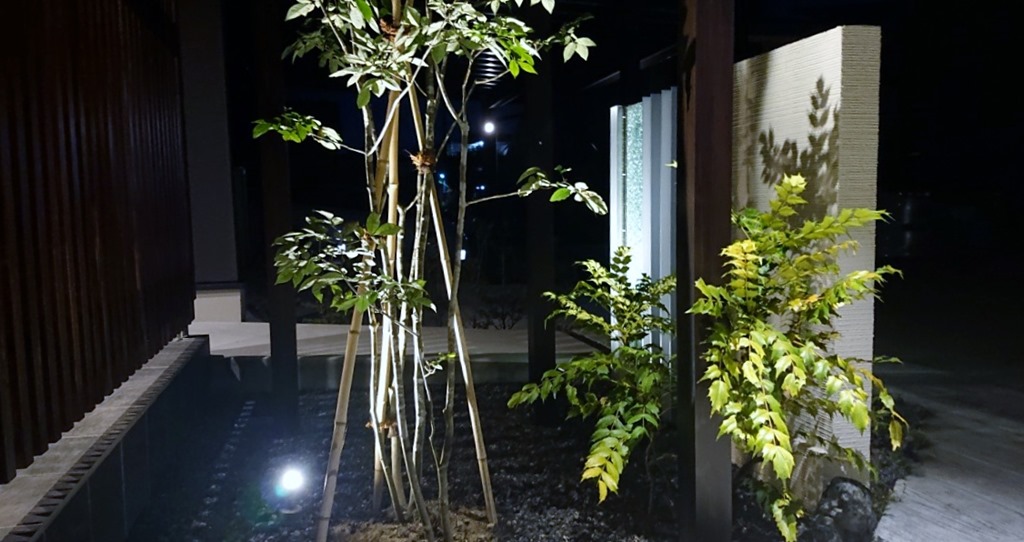 門柱の後ろ側に植えた植木を下から美彩スパイクスポットライトでライトアップ。 門柱の上にはLIXILプラスGのフレームにダウンライトを取り付け通路部分を照らしています。