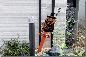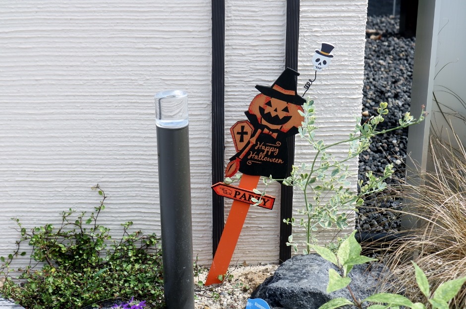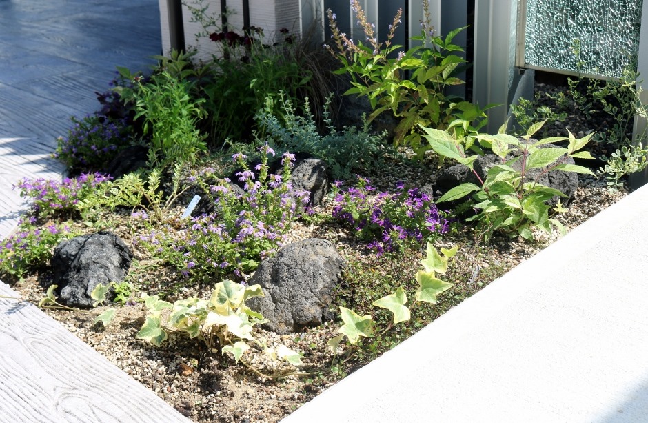 花壇スペースは浅間石を使い、宿根草を何種も植込み変化のある花壇にしています。塗壁の前には美彩ローポールライト。