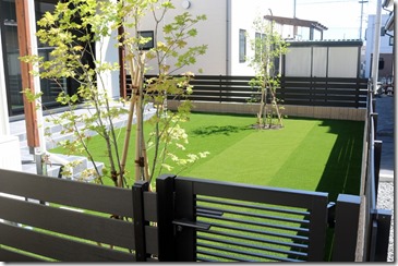 リビング前に人工芝を敷き込みドックランの空間を作りました。 周りを樹脂フェンスで囲い、駐車場側に出入りが出来るアルミ門扉片開きを設置、人工芝の中に立木を2本植えています。