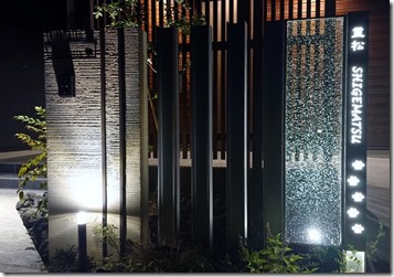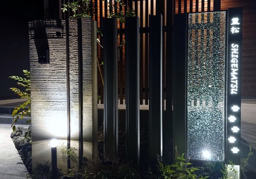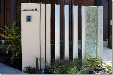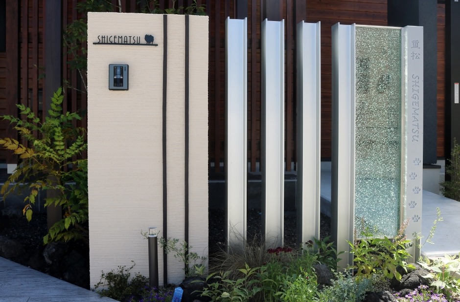 アルミH鋼10㌢角を柱にしてオリジナルのジュエルグラスを取り付けたtoledoの門柱は、レザーカットでくり抜かれた文字・デザインの裏に乳白のアクリル板を貼り中に取付けられたLEDテープがよるになると点灯してくり抜かれた文字・デザインから光が漏れて素敵なサインになっています。お客様が犬好きな事もありデザインはリクエストで犬の足形にしました、横にアルミH鋼を同じ高さにして3本立て塗壁の壁で挟んでいます。 こちらにもサインを付けて犬のデザインがあります。