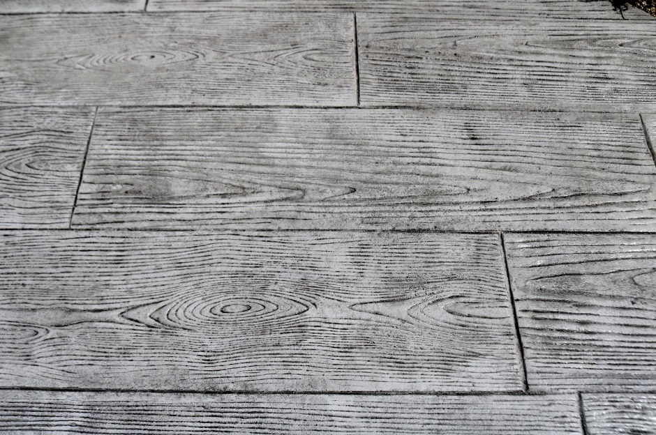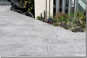 通路は、スタンプコンクリートの木目で、木目の場合ブラウン系のカラーの仕上げが多いのですが、今回はライトグレーを仕様したスタンプコンクリートです。
