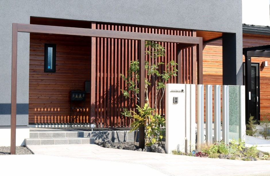 エクステリアデザインを作成する為に現場を見に行ったときに、建物を見てパットイメージしたのがシンプルで素敵な外構です。 お客様の要望でドックランの空間も設けてデザインをして、夜間になってもいい感じになるようにエクステリア照明もいくつか取り入れました。