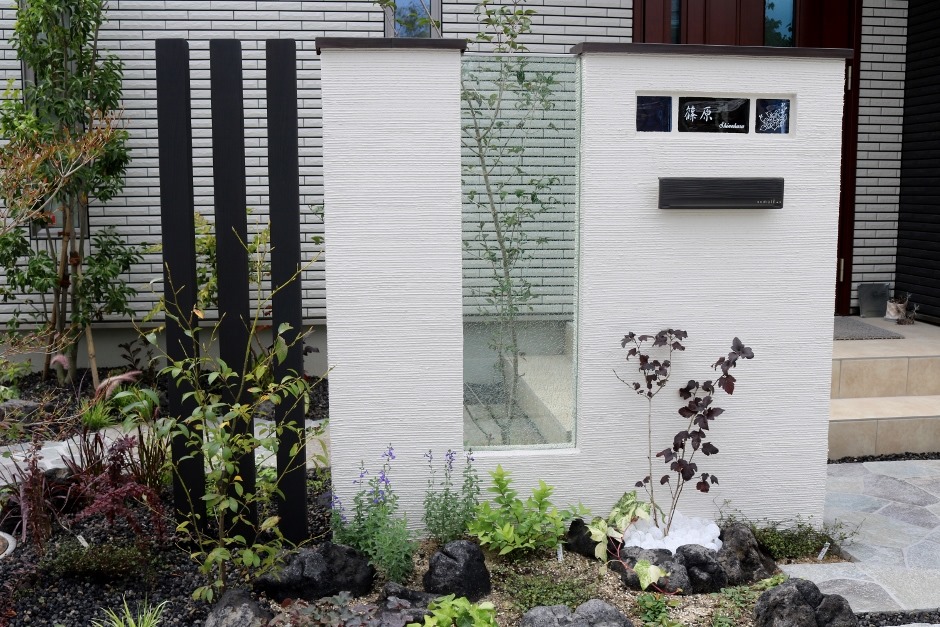 自然の景色を取り入れたフロントガーデンが仕上がりました。フロントガーデンはフェンス他で仕切らず建物の顔として美しく仕上げなくてわいけません。