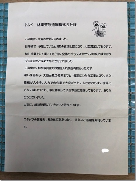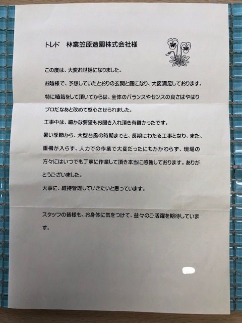 お陰様で、予想していたとおりの玄関と庭になり、大変満足しております。