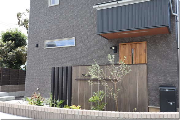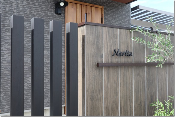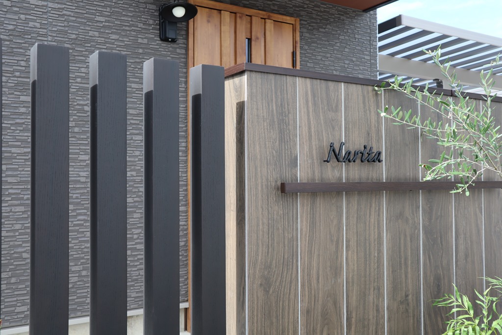 落ち着いた色の木目が建物の色とマッチしています。笠木には柿渋色のコーピング、表札はディーズガーデンの鋳物で作られたものでこれはA-03Sタイプです。