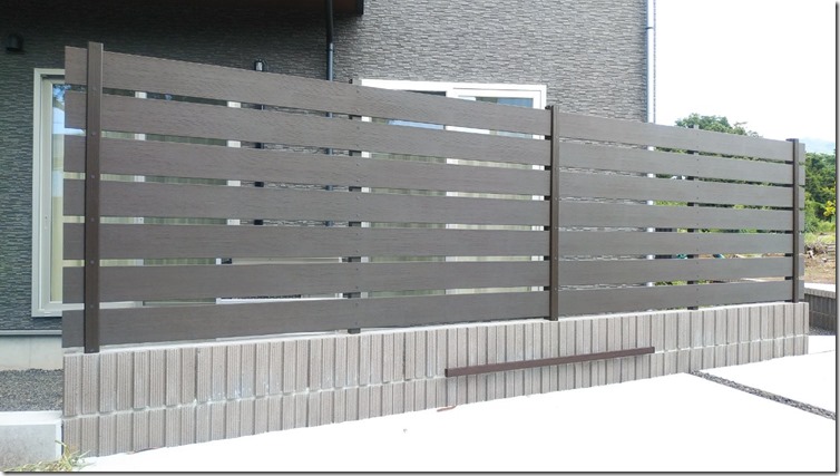 木目タイルの門柱と曲線コンクリートと2タイプの板塀