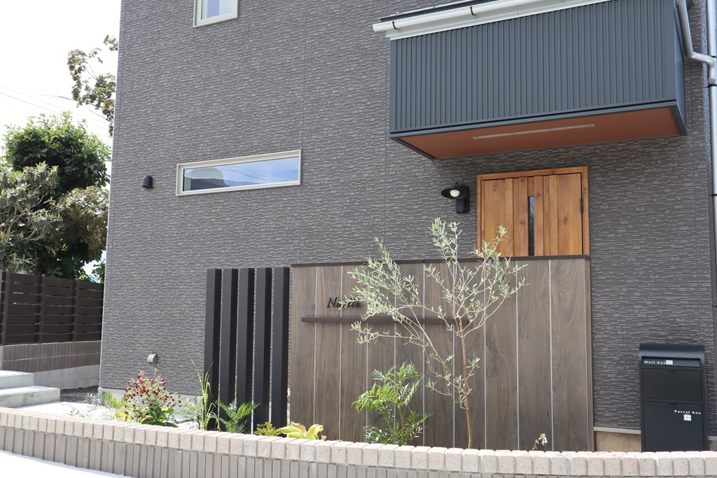 Published 2020-09-15 at 1024 × 683 in 木目タイルの門柱と曲線コンクリートと2タイプの板塀