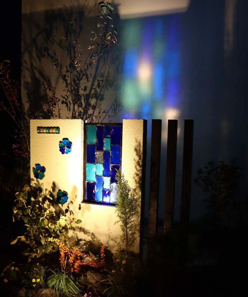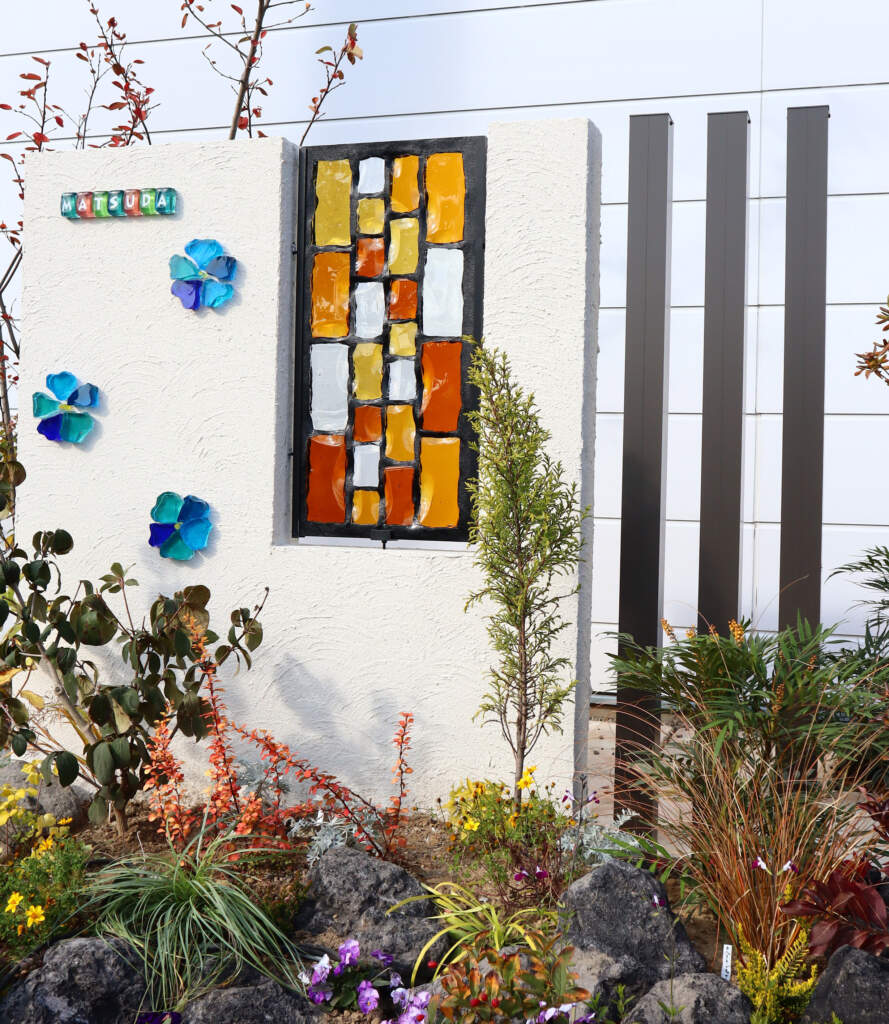 大胆に割ったガラスと耐熱耐候性塗装を施した樹脂フレームによるモダンなデザインパネル。手割りガラスの凹凸が光を反射し、美しく煌めきます。