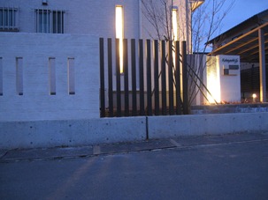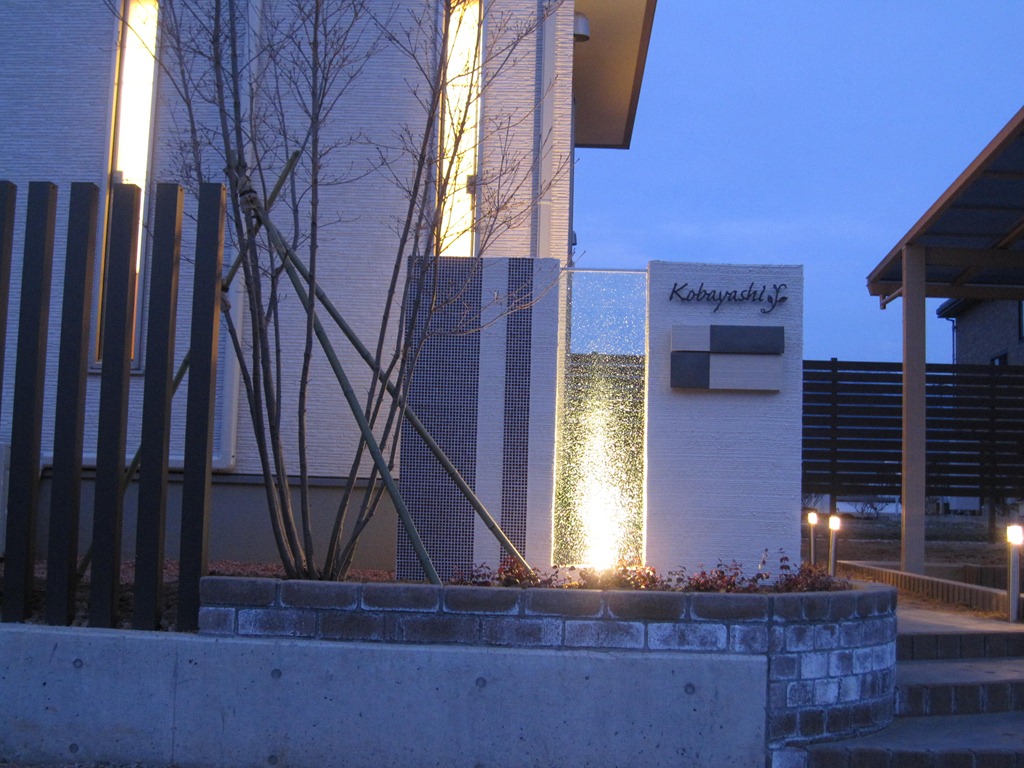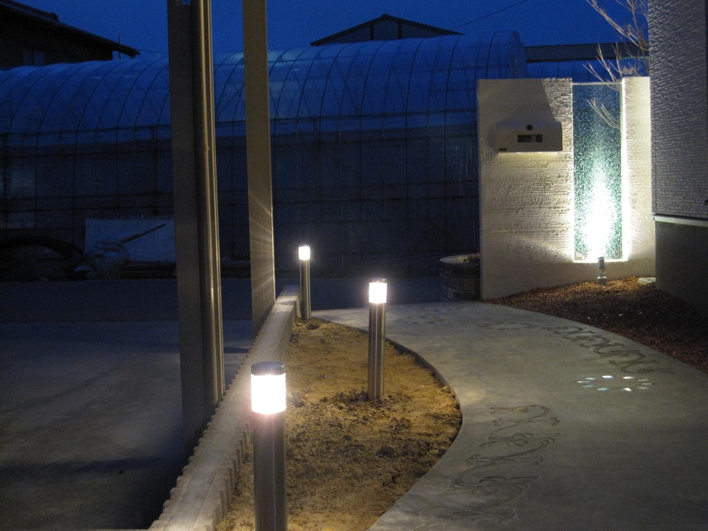 暗くなってからの階段は危ないので、通路の脇に幾つか照明を付明るく歩きやすいようにしました。門柱に組み込まれたジュエルグラスのメターも照明灯りでキラキラと綺麗です。