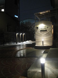 玄関側面に取り付けられた門柱には、ディーズガーデンのサインを照らす葉っぱの形をした表札灯を取り付けてサインとポスト口が夜でもわかり易くなっています。手前の花壇の中と建物の角にもガーデンポールライト2型を設置して明るくしました。