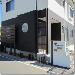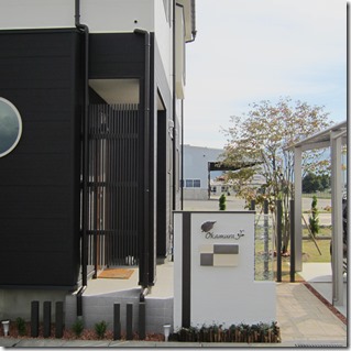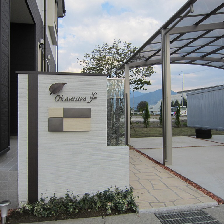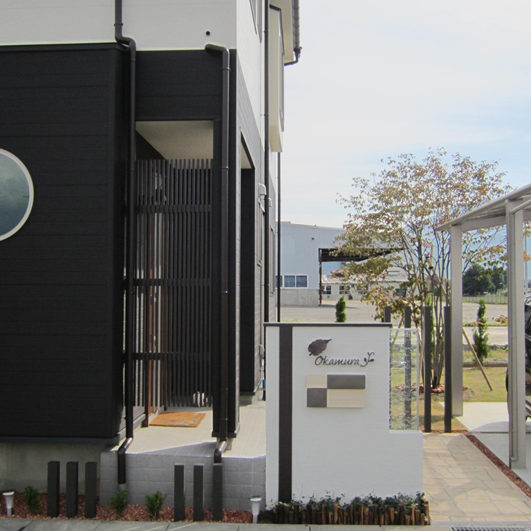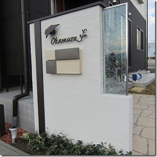 道路と建物との距離があまりない現場の施工です。最近多く見かけるシンプルモダンの建物に、ジュエルグラスを取り付けた門柱を作りました。アルミ鋳物サイン・FRPのポスト・天端の笠木・門柱の壁に貼りつけたハーフテインバー・葉っぱの形をした表札灯のすべてが、ディーズガーデンの商品です。通路を挟んで二台分のカーポートがあります。その横にもう一台止める事のできる駐車スペースがあり、ゆったりしています。アプローチのすぐ後ろに、シンボルツリーのやまぼうしの株立を植え、隣の空き地を出来るだけ隠れるようにしました。