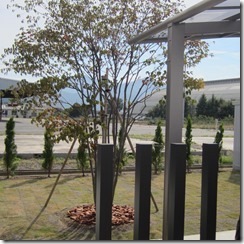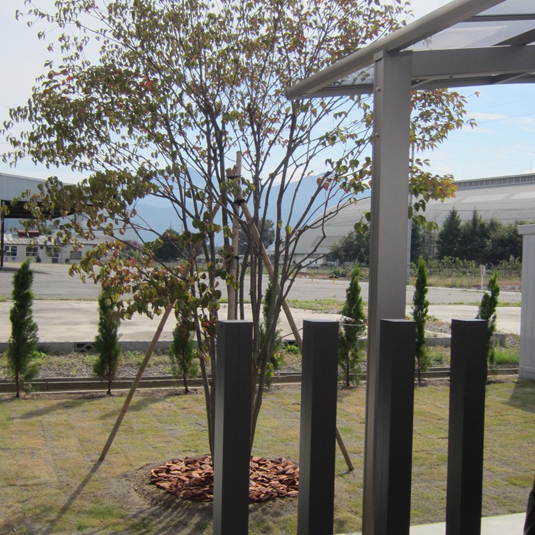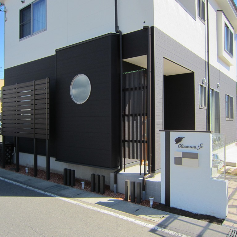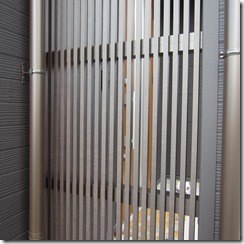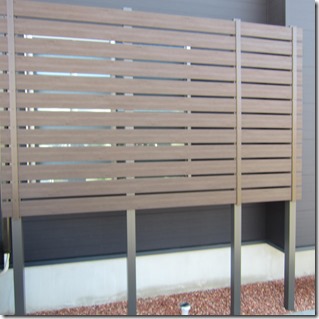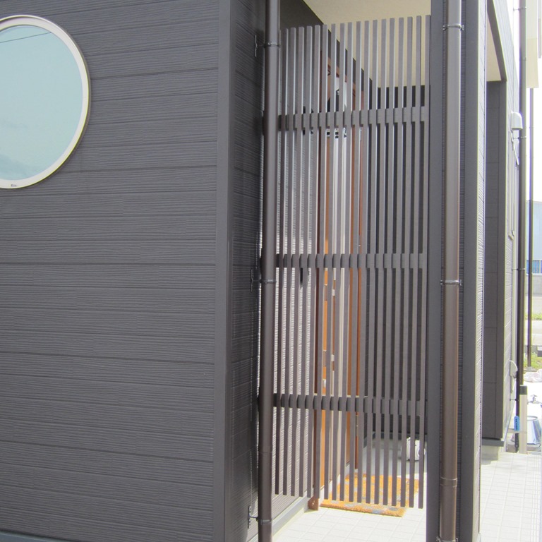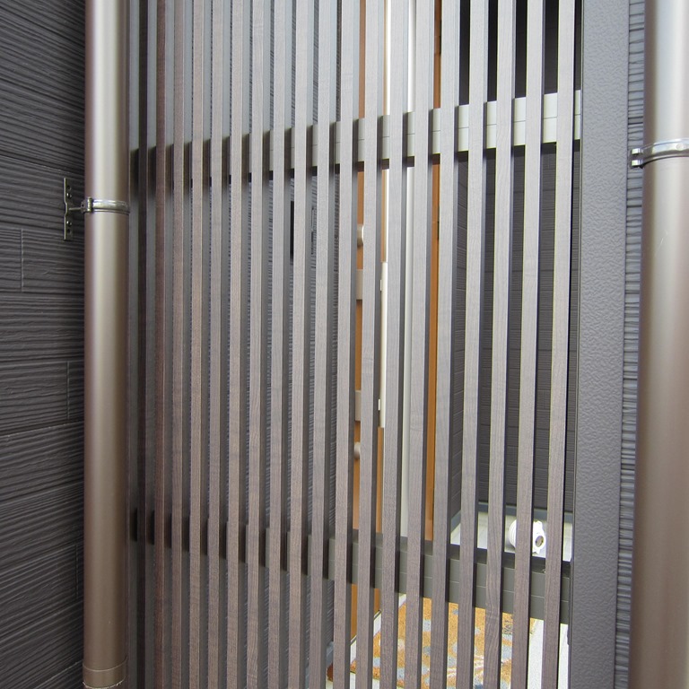 建物と道路の距離があまり無いため、気になる外からの視線が隠れるよう、アルミの柱を立て、超耐候性で作られた樹脂板のアルファウッドを上から12段張りました。アルファウッドはメンテナンスのほとんどいらない板で、柱もアルミ性ののため、見た目の変化も少なく手入れが簡単でオススメです。色は建物に合うようにディープブランです。