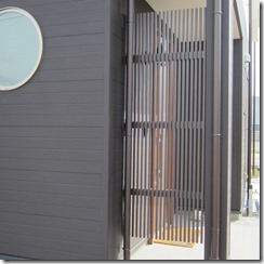 玄関の側面も気になったので、玄関ポーチとの間をデザイナーパーツの柿渋色を使い、縦格子を作りました。これで玄関の前に立っても、さほど気にならなくなったと思います。