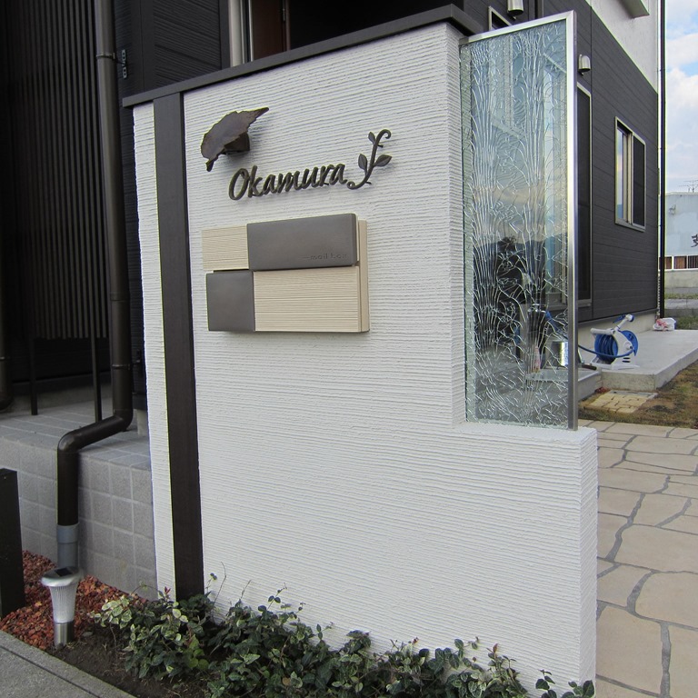 シンプルな塗り壁の門柱にジュエルグラスが取り付けました。大きめなクラック模様のティアードロップを使用しています。