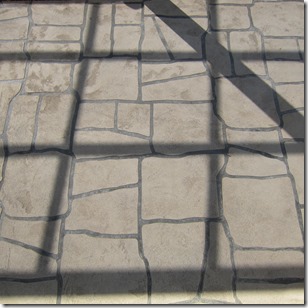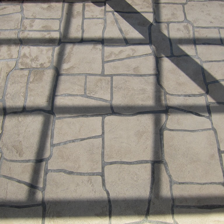 建物と道路の間の隙間には、テコラ(破砕瓦)を敷きこんでいます。見た目も普通の砕石より良いので、よく使用しています。アプローチはステンシル工法で、ベージュカラーをコンビというパターンで施工しました。アプローチと庭との境にはアルミポールを数本立て、庭との区切りを作ました。高麗芝を貼り、庭の後方にはコニファーを植えています。