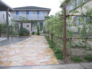 長い天然石貼りのアプローチ