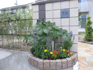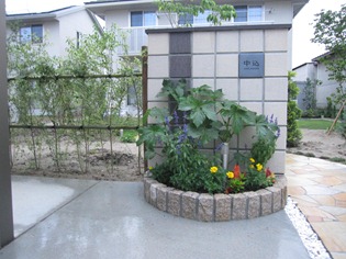 ショコラキューブを積んだ門柱です。ショコラキューブは、19センチ角のレンガ素材で、今迄のレンガのイメージを変える方形サイズです。 カラーもミルクとチョコの2色があり、組み合わせて施工することが多いです。7段積みでミルクカラーを主体にし、縦に一列だけチョコカラーを積みました。シンプルですが、今迄のレンガには無かった魅力を感じさせられます。天端の笠木は、プライムキャップのダークブラウンで、花壇は自然石の御影の錆を立てています。