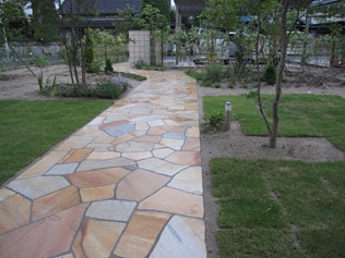 道路から玄関までの距離が長いアプローチです。道路側の入り口部分は扇状に広げ、門柱からは同じ巾で玄関まで続けて施工しています。最近よく使用されている天然石は、南米から輸入されたもので、販売ルートによって名前を変えて販売されています。今回使った商品は、パラストーンのイエローです。天然石は石英石で出来ているので、寒冷地でも使用することができます。1枚1枚表情に違いがあり、飽きる事の無い床材です。石貼りの目地が出来るだけ揃うよう加工しての作業になるので、乱貼りと違い手間が掛かります。 駐車スペースには、折半ガレージの2台分が取り付けてあり、門柱前の広い空間は、車の予備スペースになっています。