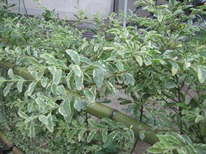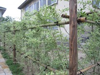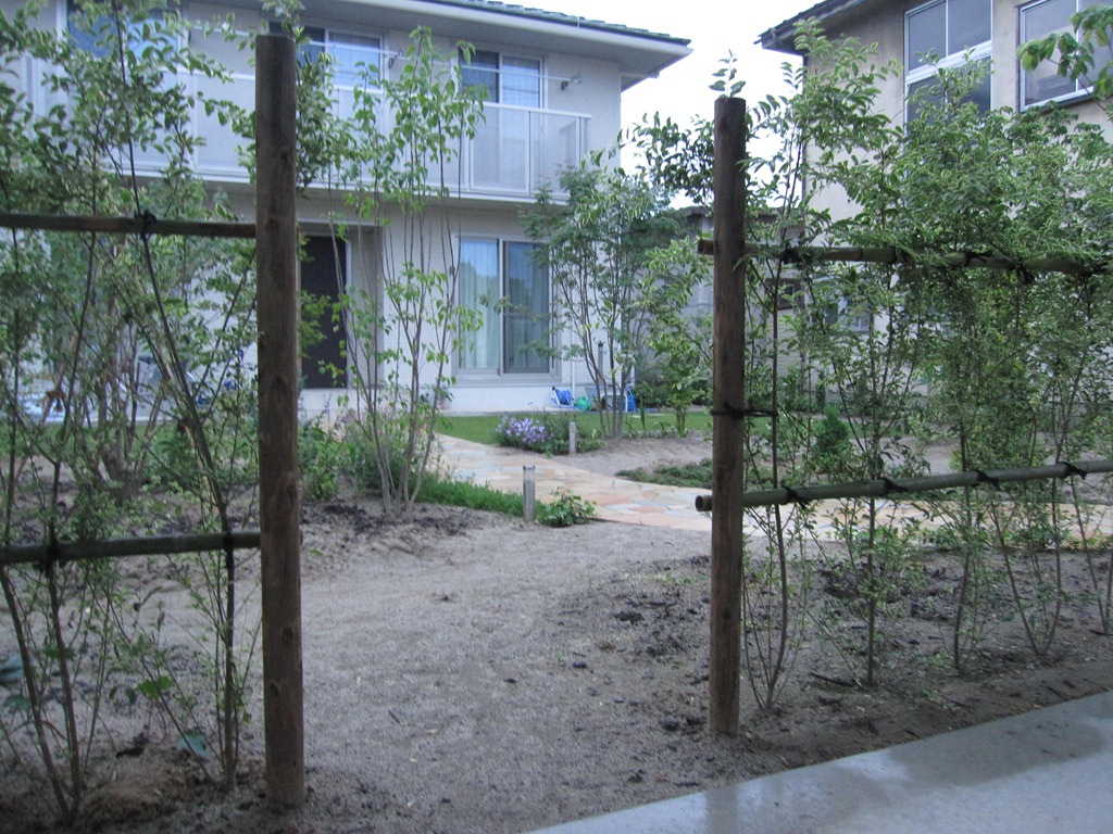 門柱横の通路部分以外は、シルバープリペットで生垣を作りました。長野の様な寒冷地では、まだ施工されている現場が少ないのですが、綺麗な模様のある葉が特徴で、あたたかい地方では常緑です。モクセイ科で別名をセイヨウイボタと言います。成長も早めで管理は楽な方です。植えてから数年して根がしっかり貼れば、寒冷地でも常緑になる場合もあります。