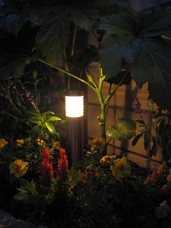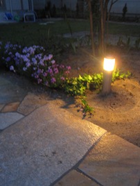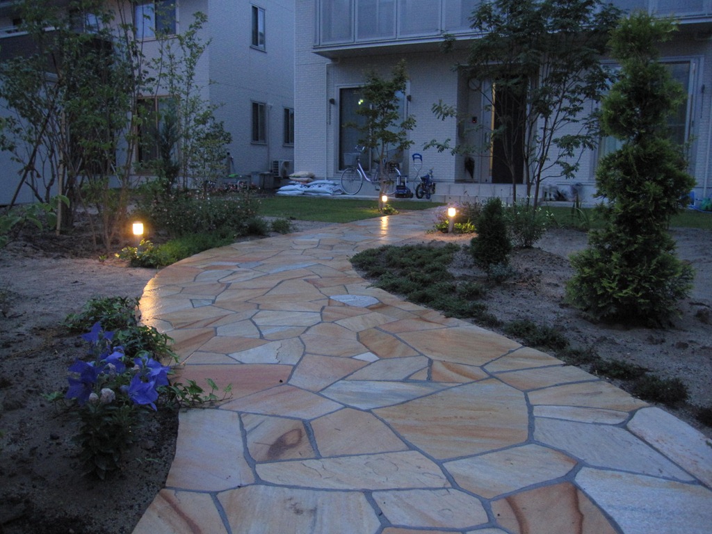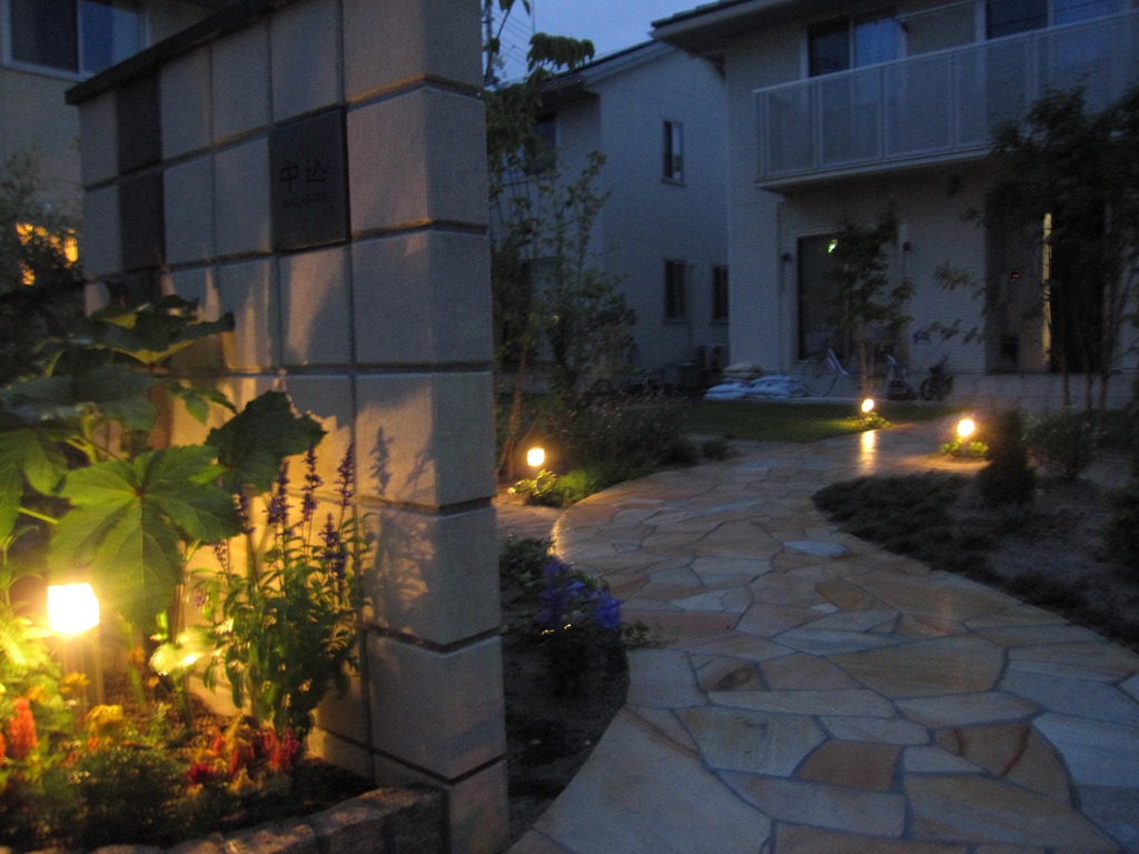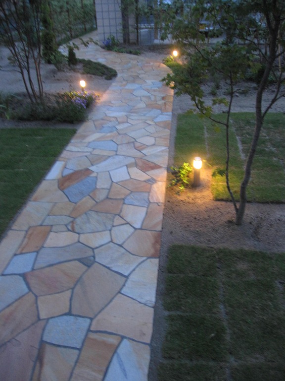 花壇の中と天然石貼りのアプローチの両脇の数カ所に、暗くなっても足元を照らして歩きやすくする為、LED照明のガーデンライト2型を設置しました。