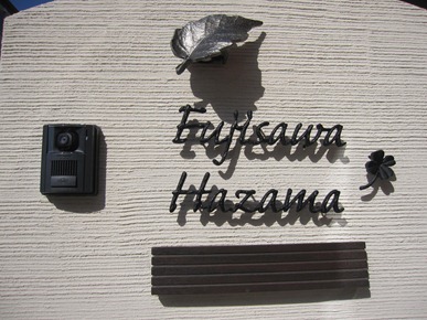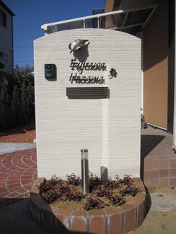 玄関横に塗壁の門柱を建てました。天端をRにして優しい感じに仕上げています。塗り壁の塗材はFウォールで、横にラインの付くウェーブ仕上げにしました。塗り壁の門柱には、ディーズガーデンのアルミ鋳物サインA-03のアールブラックを上下にふたつと、クローバーのミニオーナメントを取り付け、その斜め上には、葉っぱの形のLEDの表札灯を取り付けました。 ポストは埋め込みの口金タイプで、ウッドリブーFのダークアッシュです。インターホンも付いて、門柱の手前にはレンガを立てて花壇を作り、中にLEDのガーデンポールライトを設置しました。