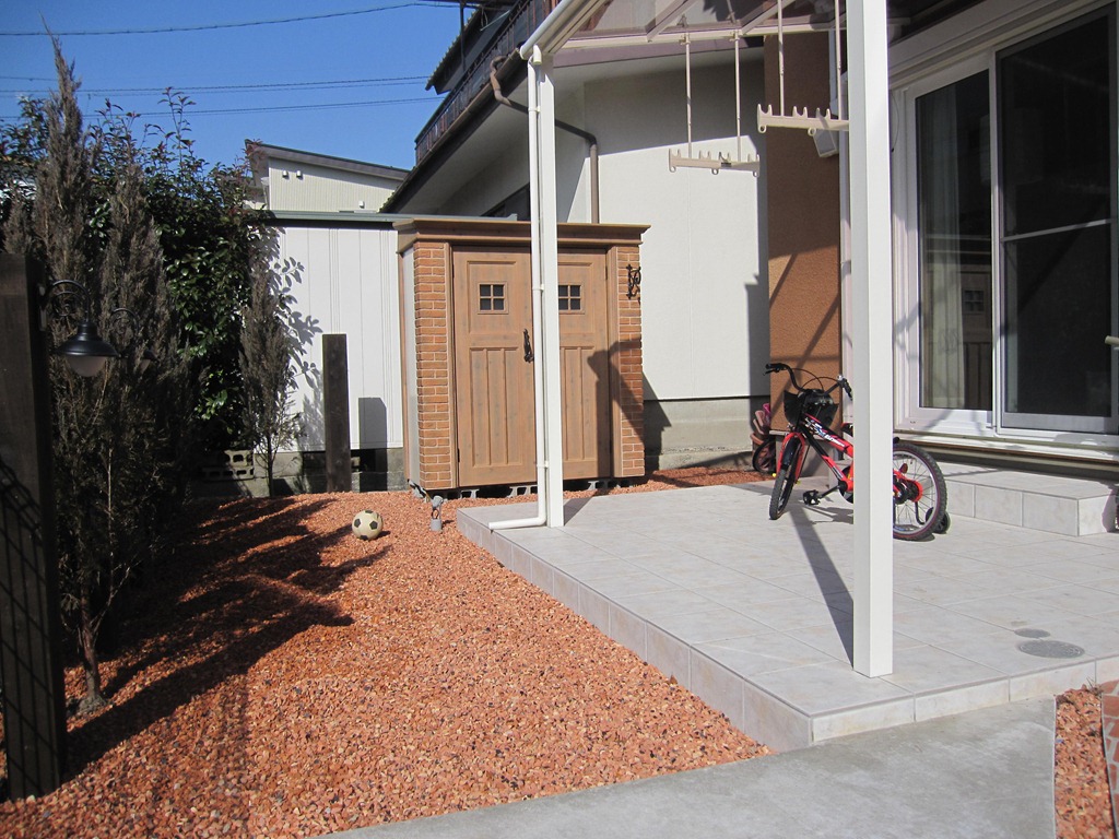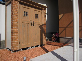 西側の境界に目隠しを兼ねて、ディーズガーデンのお洒落な物置「カンナD70」のオレンジを設置しました。存在感がありますね。他の場所にもスチールの物置があり、カンナ物置をどんなふうに使っているのかは分かりませんが、庭の飾りとして建てる客様もいるくらいおしゃれで素敵な物置です。